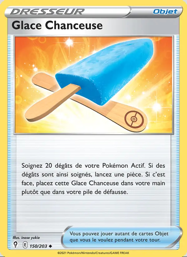 Soignez 20 dégâts de votre Pokémon Actif. Si des dégâts sont ainsi soignés, lancez une pièce. Si c'est face, placez cette Glace Chanceuse dans votre main plutôt que dans votre pile de défausse.