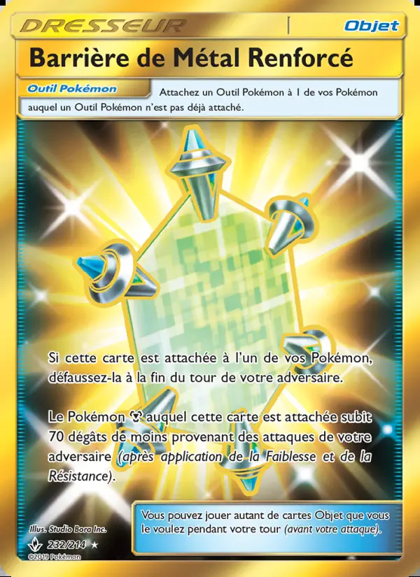 Si cette carte est attachée à l’un de vos Pokémon, défaussez-la à la fin du tour de votre adversaire. Le Pokémon Metal auquel cette carte est attachée subit 70 dégâts de moins provenant des attaques de votre adversaire (après application de la Faiblesse et de la Résistance).